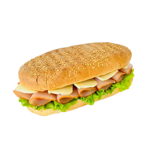 Склад: борошно пшеничне в/г, вода, цукор, сіль, дріжджі хлібопекарські, маргарин, молоко сухе знежирене, поліпшувач, кунжут; майонез (олія соняшникова, яєчний жовток, крохмаль); гірчиця (пюре яблучне, гірчичний порошок, борошно кукурудзяне, олія соняшникова, куркума, перець чорний); сир (молоко коров’яче знежирене, олія рослинна, крохмаль, закваска для сиру, хлорид кальцію, ферменти, консервант, шинка (свинина, сіль, розмарин, перець чорний, кардамон), капуста