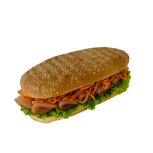Склад: борошно пшеничне в/г, вода, цукор, сіль, дріжджі хлібопекарські, маргарин, молоко сухе знежирене, поліпшувач, кунжут; майонез (олія соняшникова, яєчний жовток, крохмаль); гірчиця (пюре яблучне, гірчичний порошок, борошно кукурудзяне, куркума, перець чорний); буженина (свинина, вода, сіль, розмарин, перець чорний, кардамон, нітритна сіль), капуста, морква